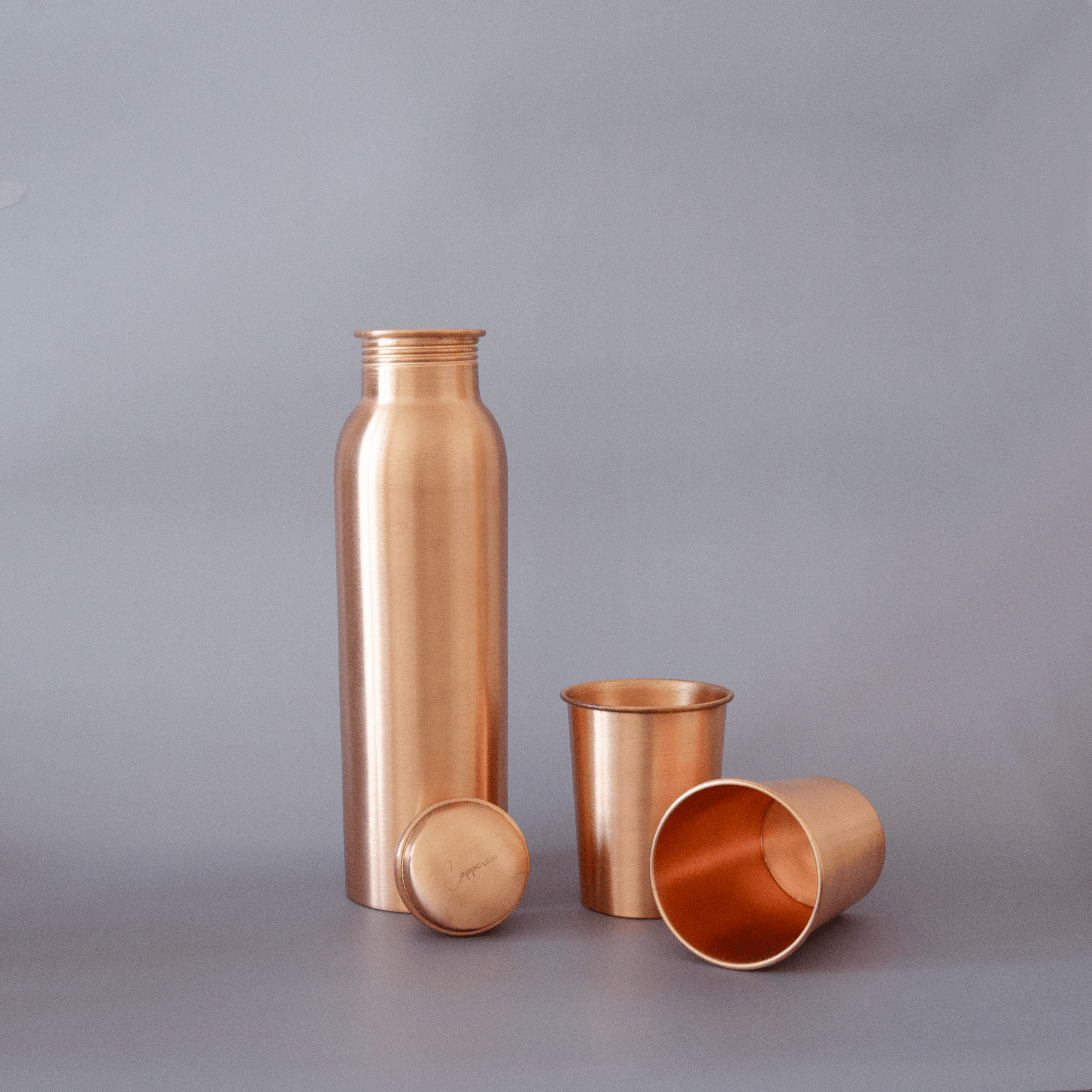 This smooth copper bottle and glasses set is so beautiful and classic that it takes you to a whole new dimension of tranquillity and peace, whilst you’re sipping your fresh water. The matte finish makes it look soft and emollient, but yet keeps it shiny and reflective.
